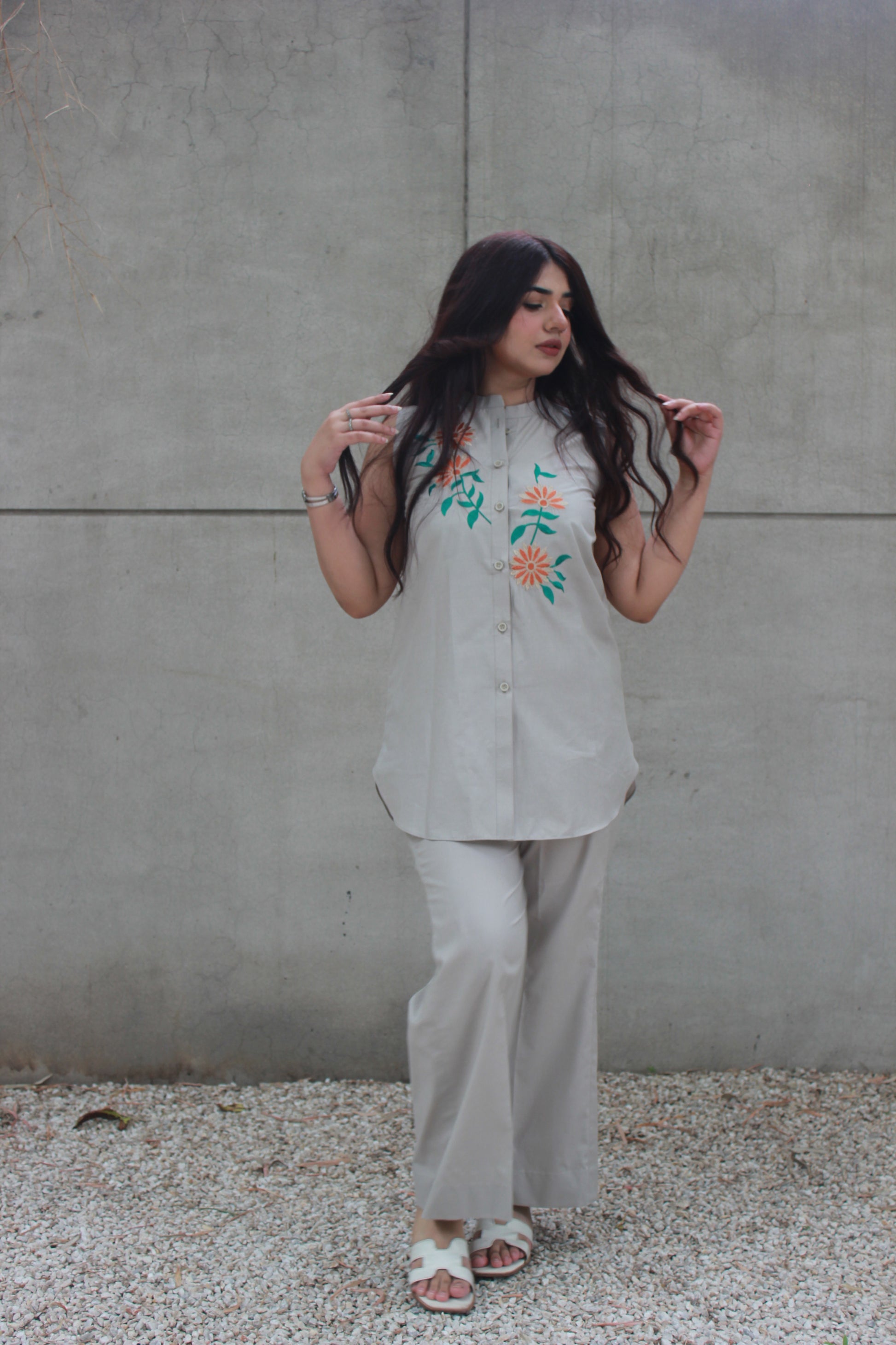 shirt with a band collar and embroidered front is styled with plain cotton trousers, making it a